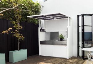The disappearing outdoor kitchen is currently a popular option. This type of kitchen is a compact, freestanding, tilt model kitchen, featuring a workspace, utensil shelf, sink and stove top, all of which can be hidden under a fold-down cover that sets at the edge of a patio or deck. One may also opt for a simple patio set and gas grill surrounded by trendy plants and flowers.